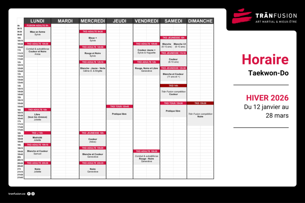 | Taekwon-Do Adulte Fusion Mise en forme | 11 semaines Du 12 janvier au 28 mars | 1 cours/semaine : 205 $ + taxes 2 cours/semaine : 369 $ + taxes 3 cours/semaine : 522,75 $ + taxes | |||